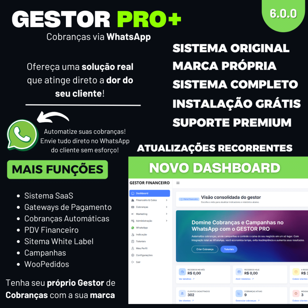 GESTOR PRO+ | SISTEMA DE COBRANÇAS PARA WHATSAPP SAAS VERSÃO 6.0.0 2026