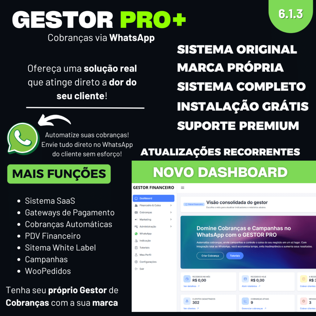 Eleve a eficiência da gestão do seu negócio com nossa ferramenta personalizada. Desenvolvida para oferecer controle preciso sobre clientes, finanças e mais, garantindo uma base sólida de confiança. Com 5 opções de gateways de pagamento, cobranças automáticas e recebimento de pagamentos de planos via Pix e cartão de forma automatizada, você poderá escalar suas cobranças via WhatsApp com facilidade.